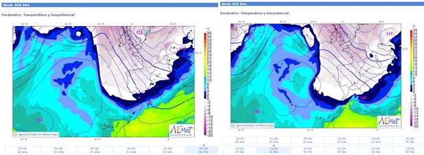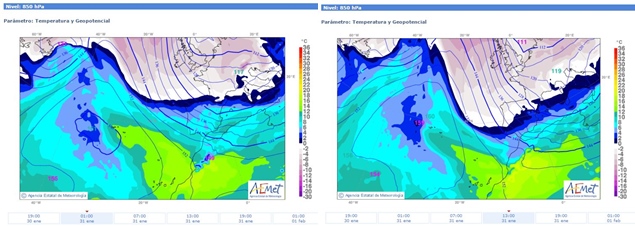En estos mapas de temperaturas a 850 hpa ( 1500 m ) previstos para hoy sabado y mañana domingo lo podéis ver también.
