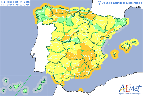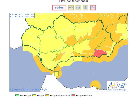La Aemet ha activado hasta las ocho de la mañana de hoy el aviso rojo por vientos en Almeria Capital y poniente Almeriense. De momento el viento no ha soplado muy fuerte en la Capital Malagueña, donde mas se ha notado esta madrugada es en las Costas de Marbella y Estepona y en Torrox y Vélez Málaga. Os paso el mapa de avisos previstos para hoy. Destacan los naranjas por nevadas en Granada y Jaén. En esta zona se activan a partir de las seis de la tarde por nevadas a partir de 600 metros.