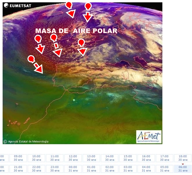 Muchos os estaréis preguntando ¿ pero Jose con las temperaturas tal altas que hacen como que va a nevar y a bajar tanto las temperaturas? Muy fácil amigos, la potente borrasca que esta centrada en Centro Europa nos envía una masa de aire polar que empezara a entrar hoy por el norte peninsular. En esta imagen de masas de aire se puede ver perfectamente. Fuente aemet, eumetsat
