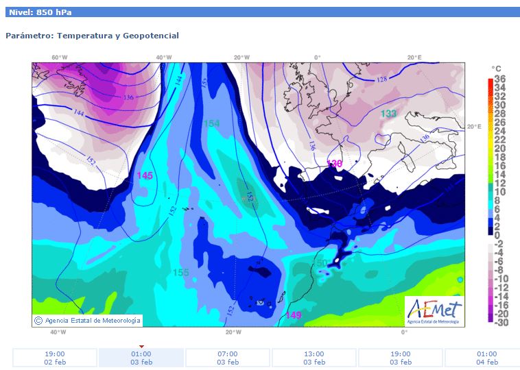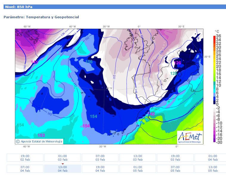 Os paso estos dos mapas de temperaturas a 850 hpa ( 1500 ) , fijarse como la masa de aire frío entra en la península.