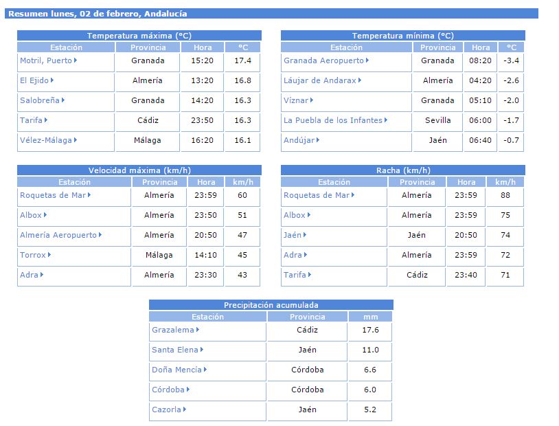 A ultima hora de la tarde noche se registraron algunos chubascos por el interior de Andalucía. Os paso los datos mas destacados que se dieron ayer. Fuente Aemet.