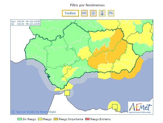 En la madrugada del miércoles se activan los avisos naranjas por nevadas en Granada y Jaén. El aviso amarillo por vientos en la Costa Granadina y Almeriense. Y el naranja por fenómenos costeros ( olas ) en Almeria.