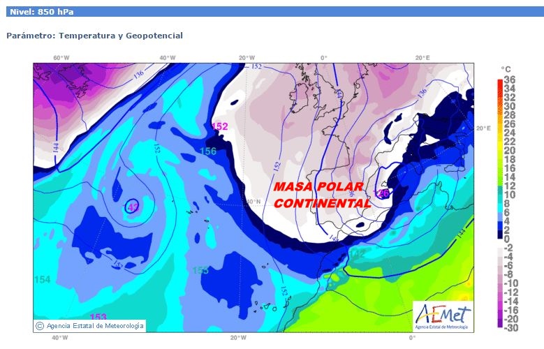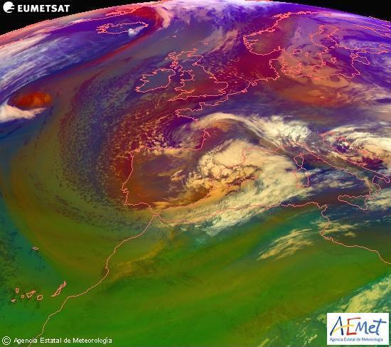 La masa de aire polar continental ya es la protagonista en toda la Península y las Baleares, aquí podéis ver en la imagen de masas de aire del satélite eumetsat a la susodicha jijij. Fuente aemet
