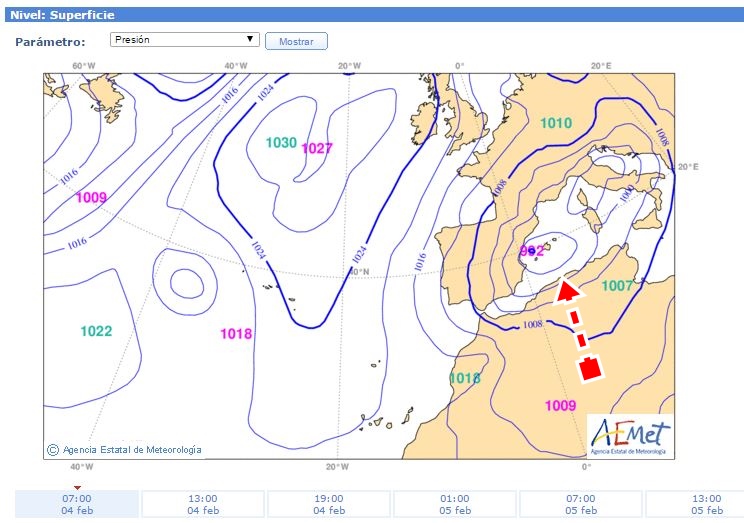 La principal protagonista de que esta masa de aire frío haya llegado a la península es esta borrasca que se encuentra en estos momento encima de las Islas Baleares y que podeis ver en las imagenes que os pongo a continuación..