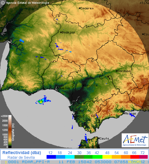 Son las siete de la mañana, registro 11 grados en Málaga Capital, los cielos están poco nubosos y el viento esta en calma. Solo distingo nubosidad por la provincia de Huelva, en esa zona ya esta cercana la bolsa de aire frío que nos afectara a los andaluces desde este mediodía y paulatinamente al resto de la Comunidad durante la tarde y madrugada del jueves.