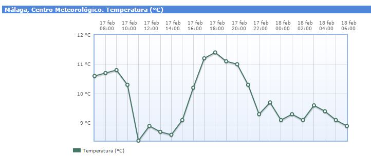 Otro dato curioso fue que la temperatura en Málaga Capital a las dos de la tarde era de 8.8 grados, luego subió hasta alcanzar los 11.9 a las cinco y media. ¿ Pero sabéis a que hora se dio la mínima del dia? pues a las once de la mañana con 8 grados.