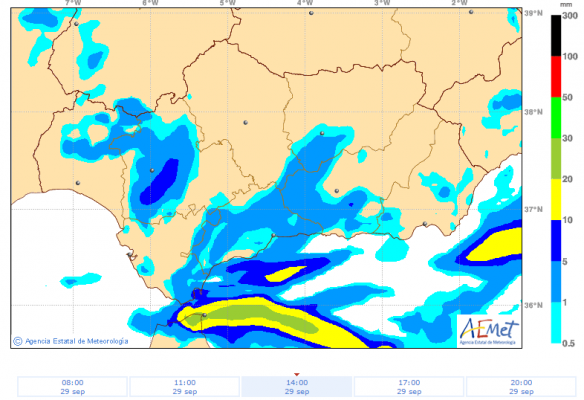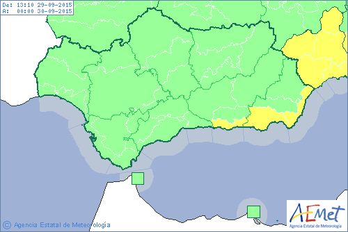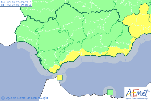 El Litoral Mediterráneo Andaluz y Ceuta esta hoy en aviso amarillo por lluvias. Fuente aemet