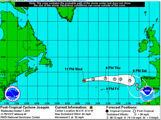 Bueno amigos de la meteo, parece ser que la gran mayoría de modelos coinciden en mandar al ex huracán Joaquín ( ya convertido en borrasca extratropical) hacia la península. En esta imagen del satélite eumetsat lo podéis ver. Aunque tiene un aspecto muy desorganizado, debido a su transición, su presión sigue siendo muy baja.