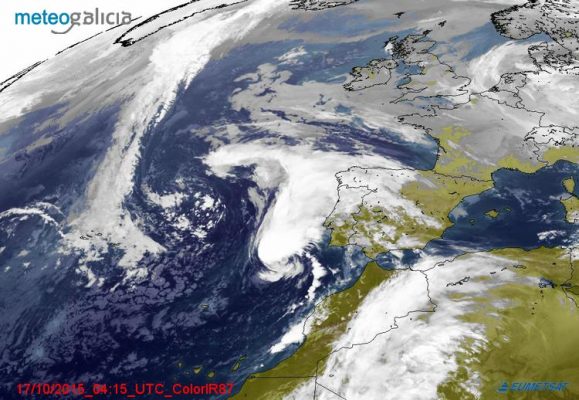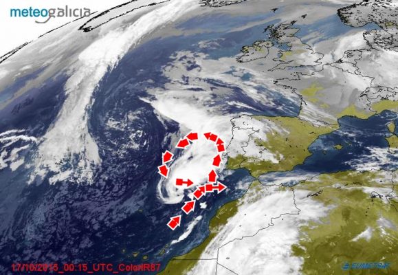 En esta imagen del satélite eumetsat lo podéis ver también. Ha subido desde Canarias, sigue camino hacia la nariz de Portugal, se desplaza hacia la izquierda y de nuevo bajaría para situarse en el Golfo de Cádiz.