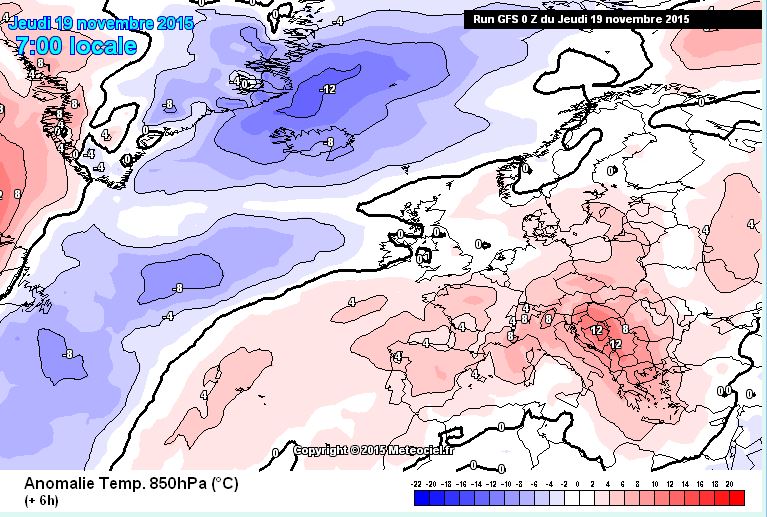 Os paso un mapa de anomalías de temperaturas a 850 hpa ( 1500 m), previsto para hoy, y otro del domingo.