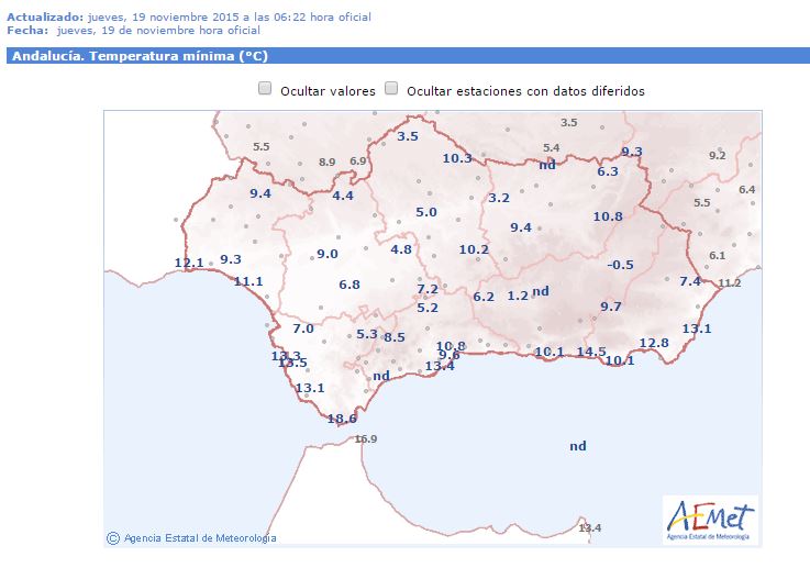 Madrugada fresquita por el interior de la comunidad, como es habitual Baza da la mínima en estos momentos. Fuente AEMET.