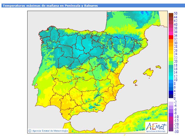 Poco que contar de la previsión del tiempo para hoy en nuestra comunidad, las temperaturas máximas serán parecidas a las de ayer. Lo único que puede ser mas destacable, son las brumas o nieblas que se puedan dar en el Litoral Mediterráneo. Os paso el mapa de máximas previstas para hoy jueves y el viernes. Fijaros como mañana suben las temperaturas máximas en toda la comunidad. Mañana viernes cuando actualice nuevamente el blog, os pondré las máximas que se esperan el sábado y el domingo.