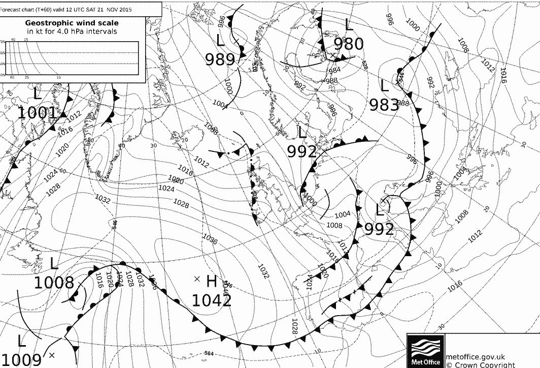El aviso amarillo se activa también por nevadas en Castilla León, Cantabria y Pirineos. Este mapa que os paso previsto para el sabado es una pasada de bonito, una autentica nortada de lujo. Una pena que el frente una vez se adentre dentro de la península perderá fuerza.