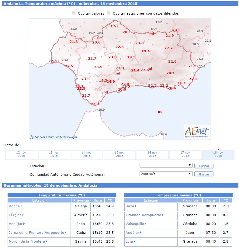 Nos vemos mañana, os dejo con los datos mas destacados que se dieron ayer en nuestra comunidad, destacar que la máxima de la península se dio en Ronda con 24,9 grados.