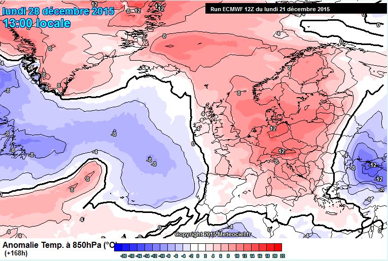 Fijaros en este mapa de anomalías de temperaturas a 850 hpa ( 1500 metros) previstos para dentro de unos dias. Impresionante lo de centro Europa. Fuente meteociel.