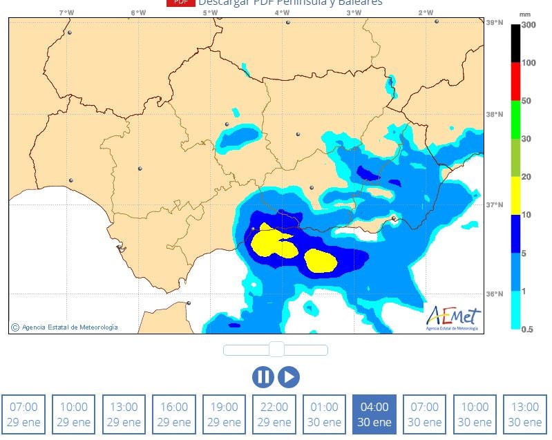 Previsión del tiempo fin de semana. Una fuerte tormenta afecto a la Provincia Malagueña. Nieva en la Sierra de las Nieves. Marbella 97 litros, Málaga 57.