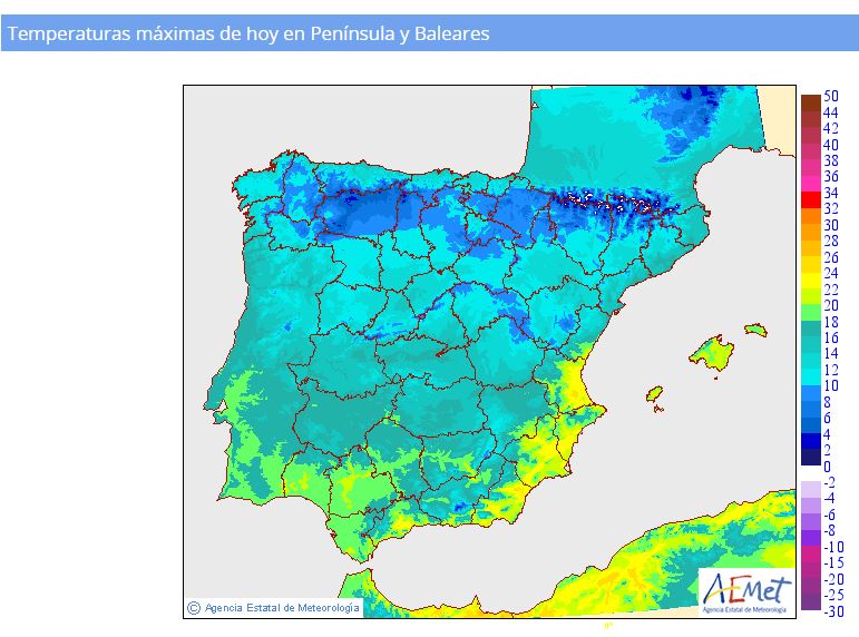 Las temperaturas máximas seguirán siendo altas para las fechas que estamos en la mayor parte de la comunidad. Ayer Málaga dio la máxima de la península con 23 grados. Os paso el mapa de temperaturas máximas previstas para hoy.