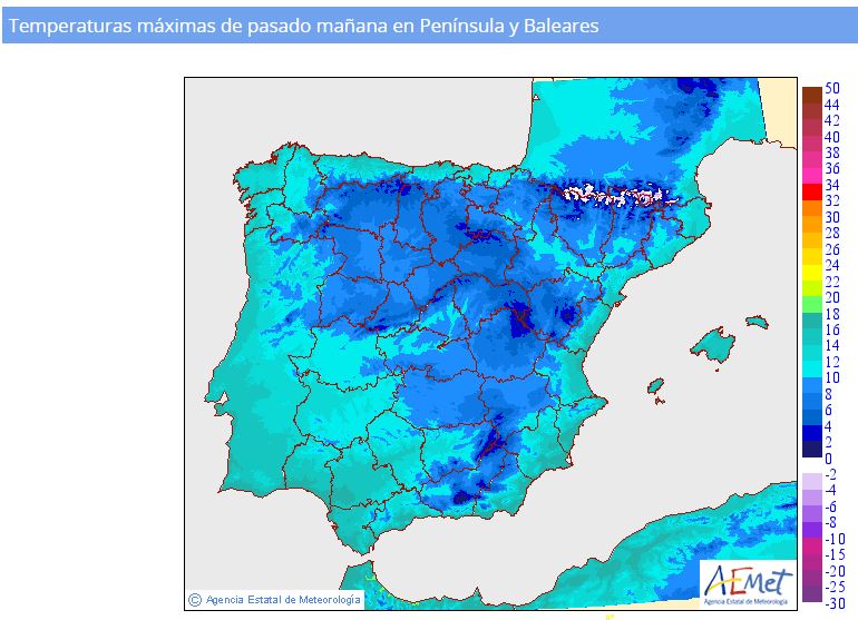 Pero fijaros que pasa el miércoles dia 6 de enero, impresionante bajada de temperaturas en toda la península. Esto se deberá a que entrara una masa de aire polar marítimo.