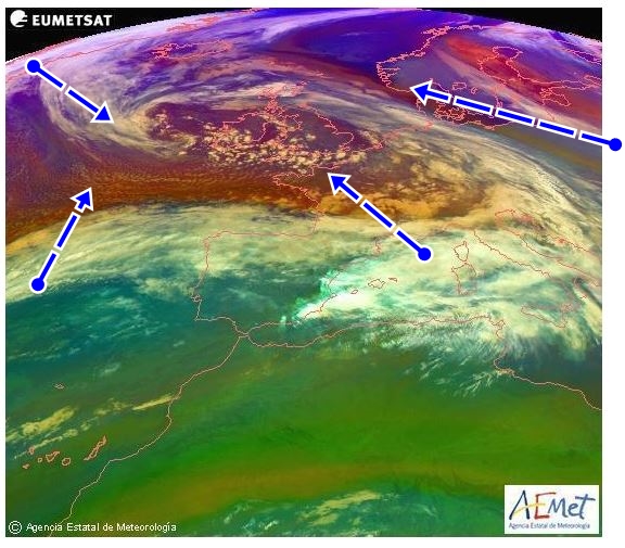 En esta imagen de masas de aire del satélite eumetsat se ve perfectamente donde esta ahora. Fuente Aemet.