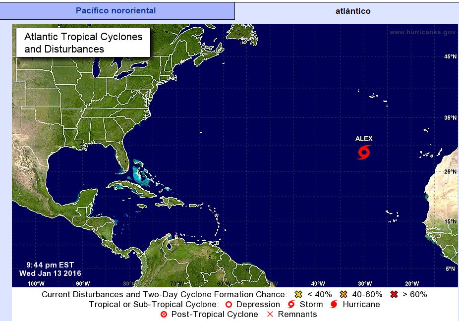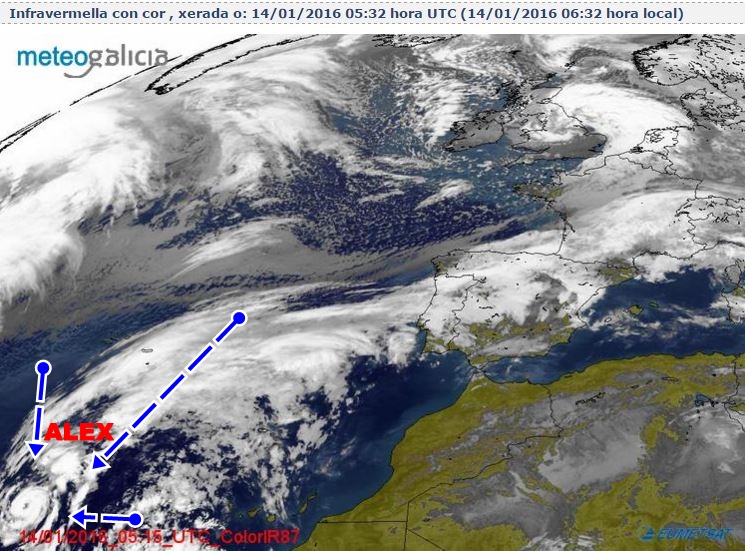 Menuda sorpresa me he llevado hace un rato cuando he visto las imágenes del satélite eumetsat, una pasada amigos. Ha nacido Alex, tormenta subtropical que se encuentra en estos momentos al oeste de las Islas Canarias. Al encontrase con aguas mas cálidas y otros factores se ha convertido en una tormenta subtropical nada habitual en estas fechas en esta zona.