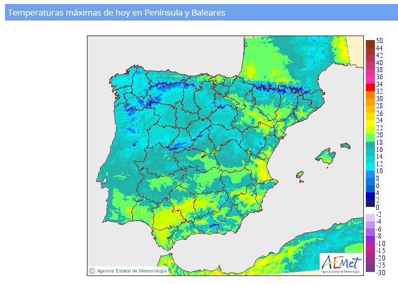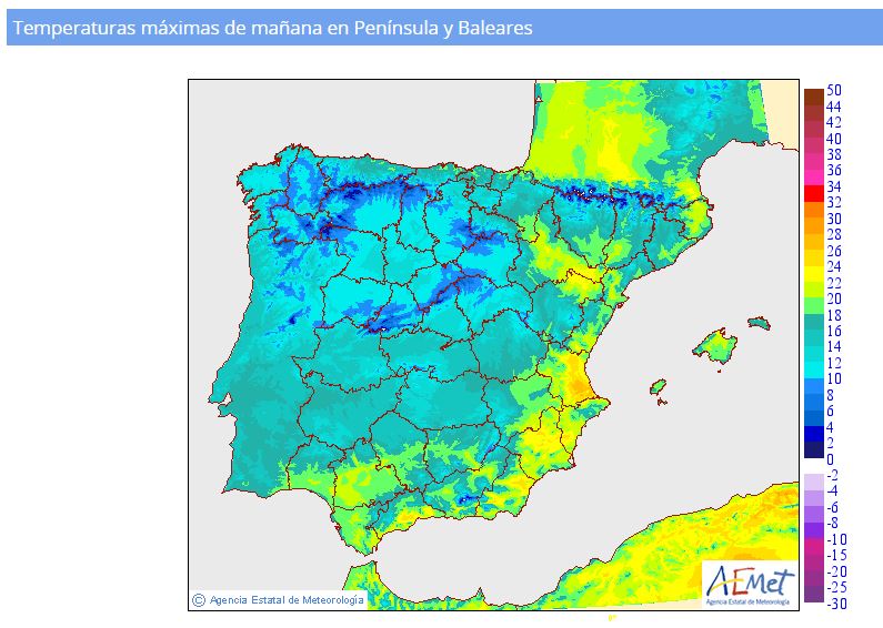 Hoy sabado las temperaturas máximas serán parecidas en nuestra comunidad a las que tuvimos ayer, salvo en las zonas donde ayer el terral fue el protagonista bajaran un par de grados o tres. Esto ultimo se deberá a que en un par de horas el levante tomara protagonismo en el Litoral Mediterráneo, con el consiguiente descenso de las máximas. Por la tarde noche el viento empezara a soplar de dirección variable. Aunque aún en el satélite no se distinguen las nieblas, pienso que en estos momentos se pueden formar en el Valle del Guadalquivir. Sobre el mediodia las nubes altas adornaran los cielos de Andalucía occidental. Os paso el mapa de máximas previstas elaborado para hoy por la aemet.