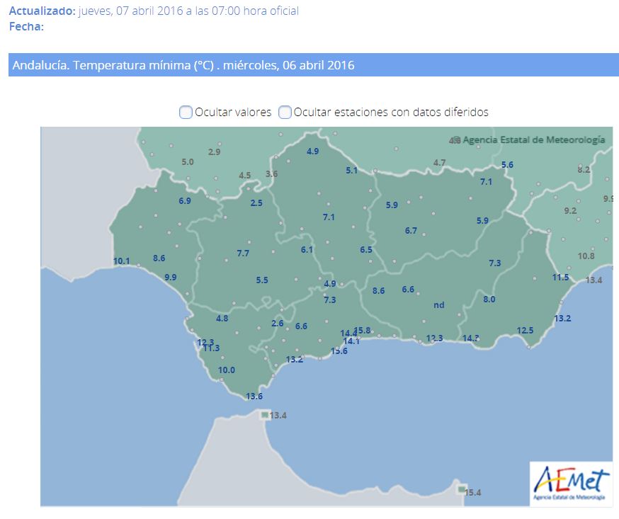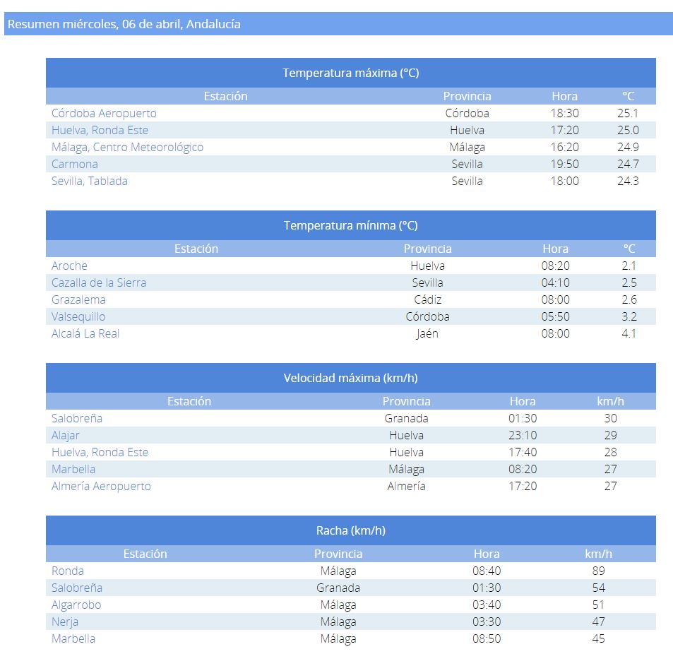 DATOS MÁS DESTACADOS DE AYER MIÉRCOLES EN ANDALUCÍA. FUENTE AEMET.