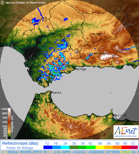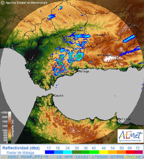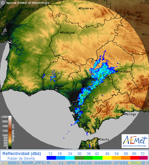 Se registran precipitaciones en estos momentos en la zona occidental andaluza, como podéis comprobar en esta imagen del radar de lluvias. Es un frente que ira perdiendo fuerza a medida que avance.
