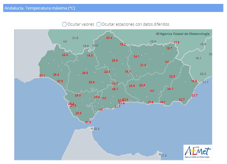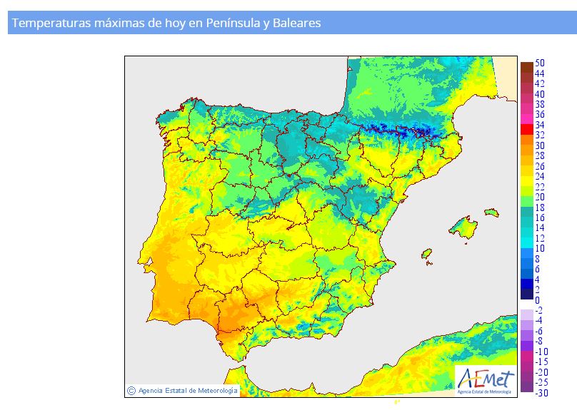 Las máximas subirán en el interior oriental, y sin cambios en el resto. Os paso el mapa de temperaturas máximas previstas en la península. Fuente aemet.