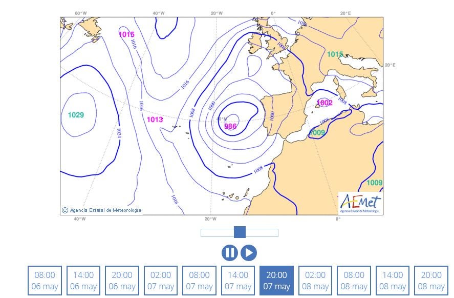 El tiempo en Andalucia. Aviso amarillo por lluvias en la provincia malagueña. Fuerte proceso de ciclogénesis en el Atlántico al oeste de Portugal.