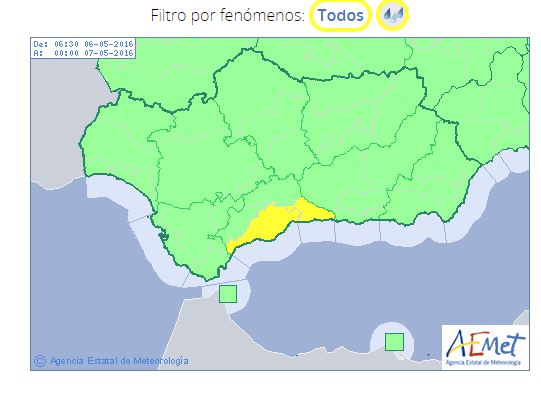Buenos dias amigos de la meteorología, son las siete de la mañana, mi estación en Málaga Capital registra 18 grados, los cielos están muy nubosos y sopla viento de sur. La aemet activa el aviso amarillo por lluvias en casi toda la provincia malagueña. Fuente aemet.
