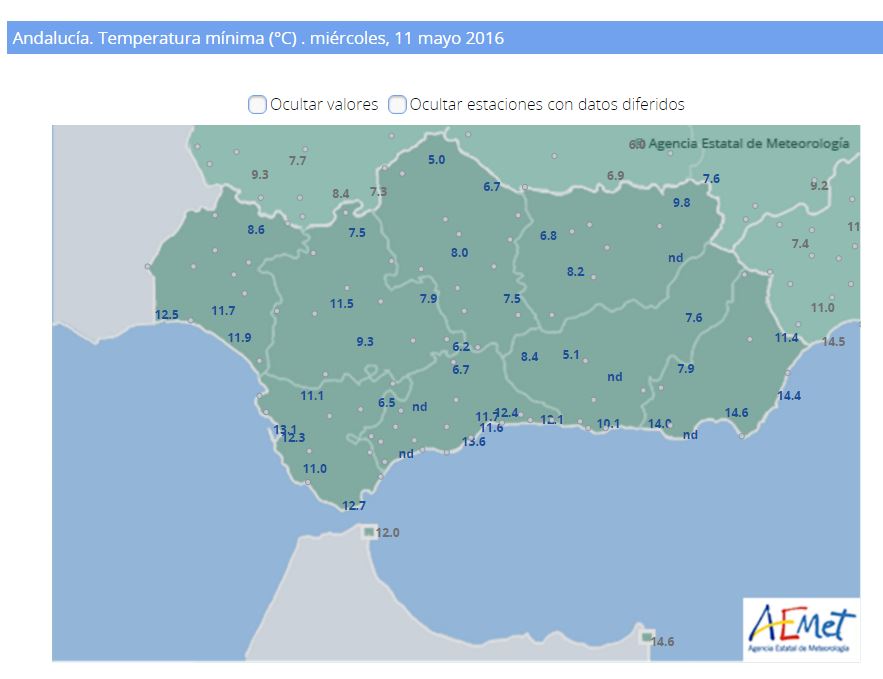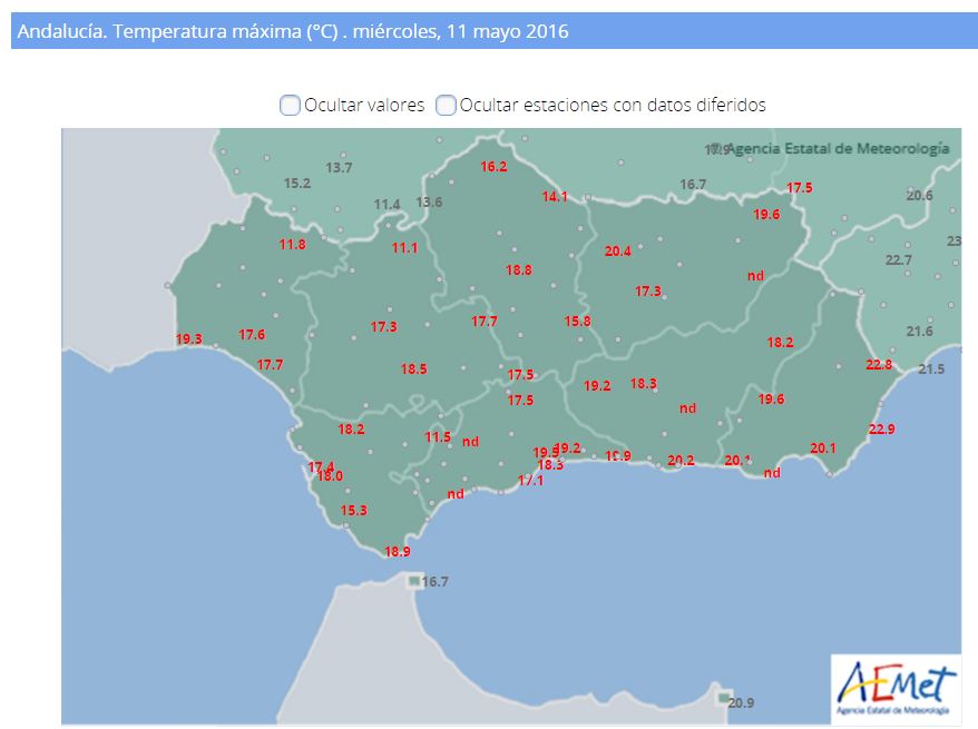 Lo que si tomara protagonismo hoy sera el viento, por este motivo la aemet activa el aviso amarillo en el Estrecho y Almería. Las temperaturas máximas subirán un poco con respecto a las que tuvimos ayer miércoles. Fuente aemet.