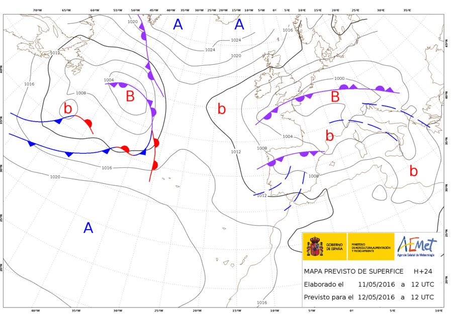 Nuestra gran amiga la borrasca Xandrea dará hoy jueves y mañana viernes sus últimos coletazos, sube de latitud durante el dia de hoy, y la próxima madrugada se reintegrara a la circulación general. Os paso el mapa previsto en superficie. Fuente aemet.