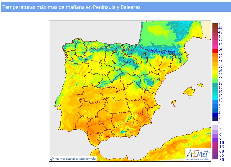 Os paso el mapa de máximas previstas para mañana en la península.Lo más seguro es que Álora y Coín den las máximas de España. Fuente aemet.