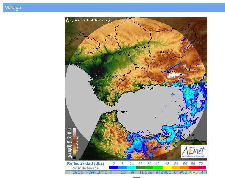 Buenos dias amigos de la meteorología, son las seis de la mañana, mi estación en Málaga Capital registra 18,7 grados, el viento esta en calma y los cielos algo nubosos. La nubosidad mas compacta se da ahora mismo en la zona mas oriental de nuestra comunidad. Según el radar se registran precipitaciones débiles en los litorales de Granada, Almería y Melilla, estas van acompañadas de barro. Os paso la imagen reciente del satélite eumetsat fuente meteogalicia y el radar de lluvias de Málaga, fuente aemet.