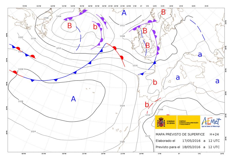 Una baja relativa situada en el entorno al Estrecho, hace que entre esa nubosidad desde el norte de África. Puede dejar algún chubasco débil de barro en el litoral mediterráneo durante la mañana de hoy, como os comento más arriba, pienso que ya se están dando. También hay probabilidad de chubascos tormentosos en los sistemas montañosos de nuestra comunidad durante la tarde, esto se deberá al aire frío que os comentaba el lunes pasado en el post. Os paso el mapa de superficie elaborado por la aemet.