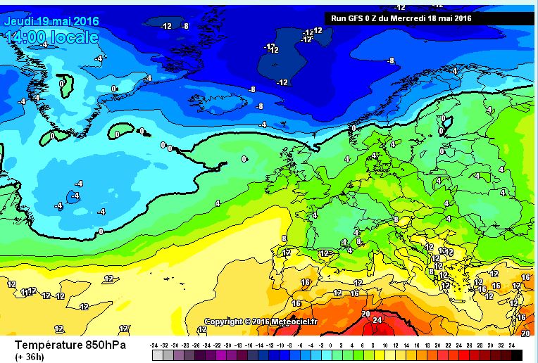 Como os comento en el titulo del post, mañana el terral sera protagonista en Málaga Capital así como en el Valle del Guadalhorce, Estepona y Vélez Málaga. Hay muchas dudas con la máxima que daremos, pero pienso que sobrepasaremos los 30 grados e incluso más. También dependerá de la hora que entre y sobre todo de la temperatura que tengamos a 850 hpa ( 1500 metros). Mañana de las tres estaciones que tiene la aemet en Málaga capital, dará una temperatura distinta. Como podéis comprobar en el mapa que os pongo a continuación a 850 hpa rondara entre los 16 y 18 grados. Fuente meteociel.