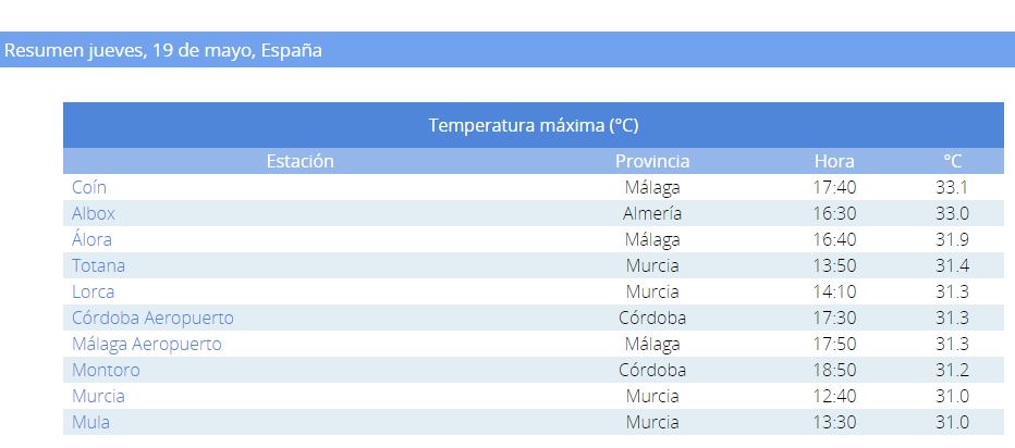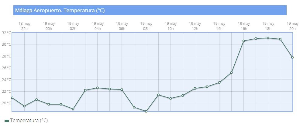 La máxima de España se dio en Coín con 33,1 grados, en Málaga Capital fue la estación del Aeropuerto la que dio la máxima temperatura con 31,3 grados.