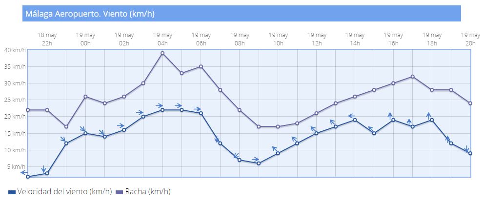 A mi pregunta que si el terral entro ayer en Málaga Capital, pues la respuesta es que si. Lo curioso es que entro a partir de las dos de la mañana y luego más tarde sobre las diez de la noche, como se ha podido comprobar en las estaciones que tiene la aemet en la capital. Sobre las ocho de la mañana cambio a sureste y sur en las tres estaciones. Ayer os comentaba que podríamos tener mucha diferencia entre máximas de una estación a otra, pues así ha sido amigos. Pero lo mas curioso es que cuando se daba la máxima en el Aeropuerto por la tarde, en ningún momento soplaba terral en esa zona, si no sur como podéis ver en los gráficos que os pongo. Fuente aemet.