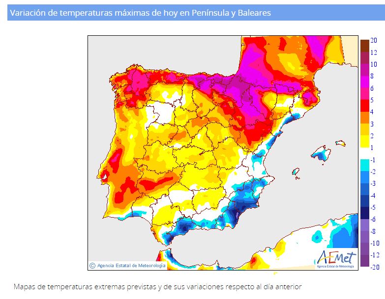 Sobre la previsión de hoy en Andalucía, destacar solo que las máximas bajaran donde ayer hubo terral, y subirán un poco por el Valle del Guadalquivir, Jaén e interior de Granada. Os paso este mapa de máximas previstas para hoy viernes y la diferencia con las que tuvimos el jueves. Fuente aemet