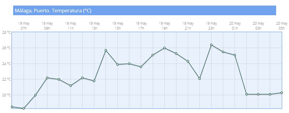 Como os comento más arriba, en el Puerto en la madrugada también entro el terral, pero más tarde fue protagonista el levante y el sureste. Más tarde sobre las once de la noche entro terral, dandose la máxima con mas de 26 grados a las once de la noche. Os pongo los gráficos.
