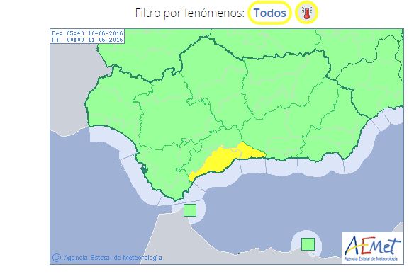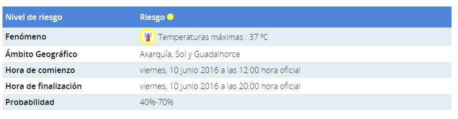 Ayer os comentaba que la masa de aire cálida se desplazaba hacia el este de nuestra comunidad, y que en las ultimas salidas de modelos de temperaturas a 850 hpa ( 1500 metros) teníamos en la provincia malagueña entre 18 y 20 grados. A ultima hora de anoche en una nueva actualización de los modelos, esta temperatura la subían a 21 y 22 grados. Si ayer se esperaban entre 35 y 36 grados, hoy podemos sobrepasar los 37 grados. Por este motivo la AEMET ha activado el aviso amarillo por altas temperaturas ( 37 grados) en Málaga Capital, Guadalhorce y Axarquía. Como muchos sabéis el umbral para activar el aviso amarillo en Málaga Capital es de 36 a 38 grados.