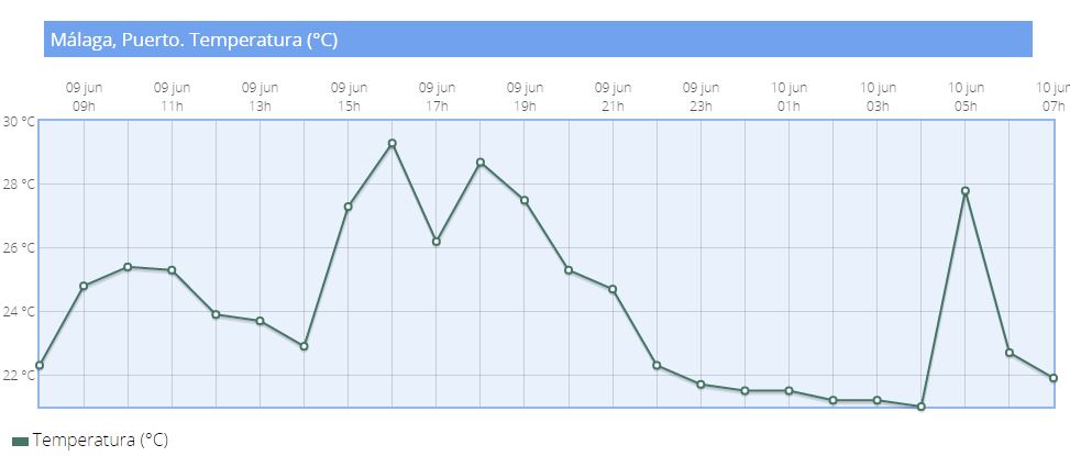 Esta pasada madrugada ha entrado nuestro amigo el terral sobre las tres y cuarto de la mañana. Impresionante el gráfico de temperaturas de la estación de la aemet del Aeropuerto Malagueño, la subida ha sido impresionante en pocos minutos. También curioso lo que ha sucedido en la Estación del Puerto Malagueño, donde casi a la misma hora entro el terral como podéis comprobar en el segundo gráfico, y más tarde la bajada que ha tenido por una reboza de levante jijiji, están luchando los dos vientos. Fuente aemet.