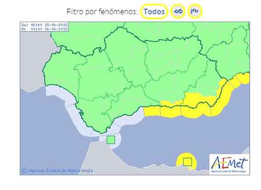 En lo que respecta al resto de la Comunidad Andaluza, destacar rachas muy fuertes de componente oeste en el litoral mediterráneo oriental y Melilla. Notable descenso de las máximas, salvo en el interior oriental Almeriense donde subirán. En muchos puntos de Andalucía las mínimas se darán a ultima hora de la noche de hoy. Debido a las rachas fuertes de viento que se esperan, la aemet activa el aviso amarillo por viento y olas en los litorales de Málaga, Melilla, Granada y Almería. Fuente aemet,meteociel gfs
