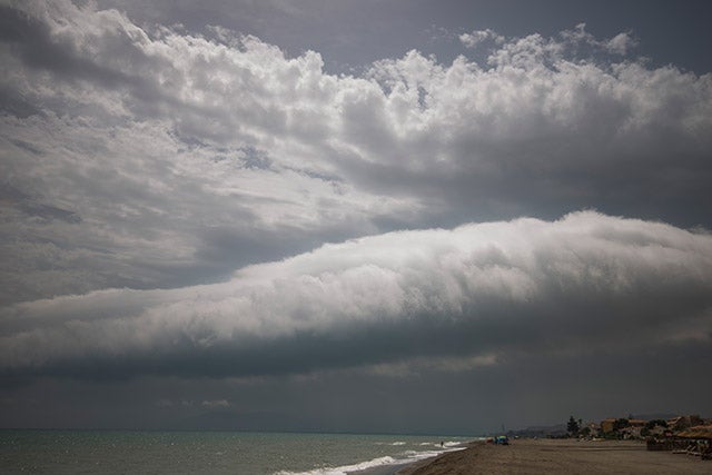 El tiempo en Andalucía. Aviso amarillo por altas temperaturas en Málaga Capital. Terral. Posible minigalerna.Fotos nube rodillo en Torre de Benagalbón.