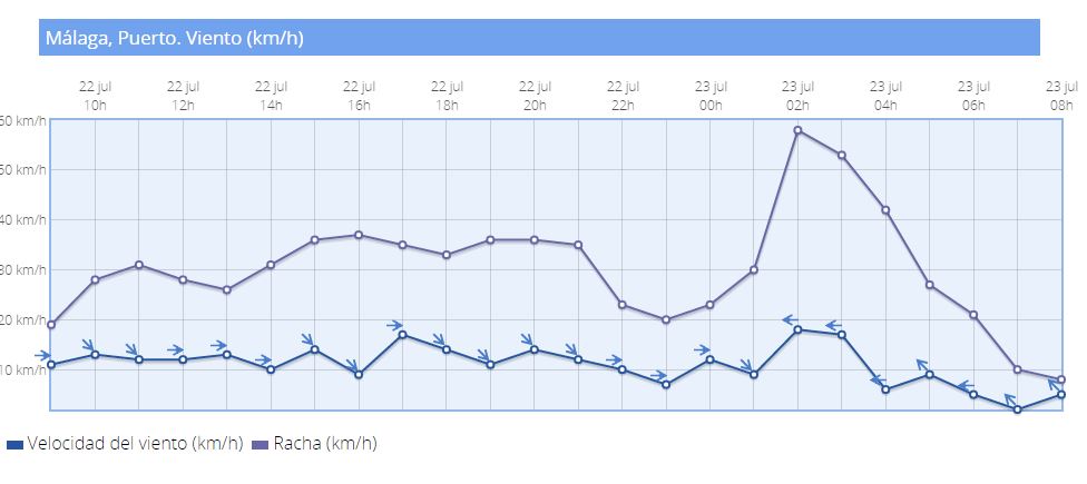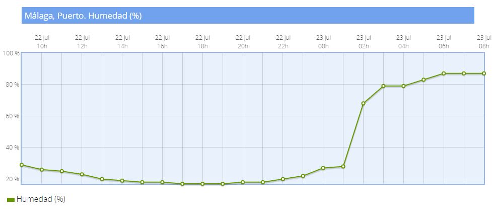 Son las nueve de la mañana en Málaga Capital, y aprovechando que he venido a casa para coger unas cosas, os actualizo el blog para comentaros que pasada la media noche tuvimos en la Costa Malagueña una impresionante minigalerna malagueña. Yo medí con mi anemómetro de mano una racha de 68 kilómetros por hora en Torre de Benagalbón a las una menos diez. Fue brutal, como de pronto entraron nubes bajas de levante. La pena que era de noche. La minigalerna se forma por el cambio de masas de aire secas del terral por las húmedas del levante. Os paso las gráficas de humedad, viento y temperatura de la estación de la aemet del puerto malagueño.