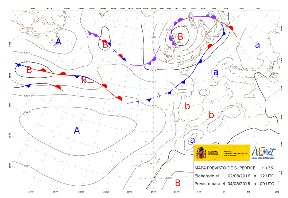 Mañana jueves se activa el aviso amarillo por altas temperaturas en Málaga Capital y Valle del Guadalhorce, en esta ultima zona sera donde las máximas sean más altas. En la campiña Cordobesa y Jaén también se activa este aviso. El paso de un frente frío por el norte peninsular, hará que los vientos giren al oeste. Os paso el mapa de superficie. Fuente aemet.