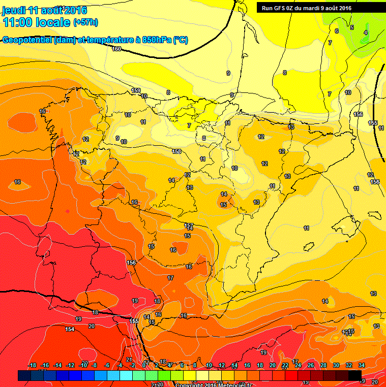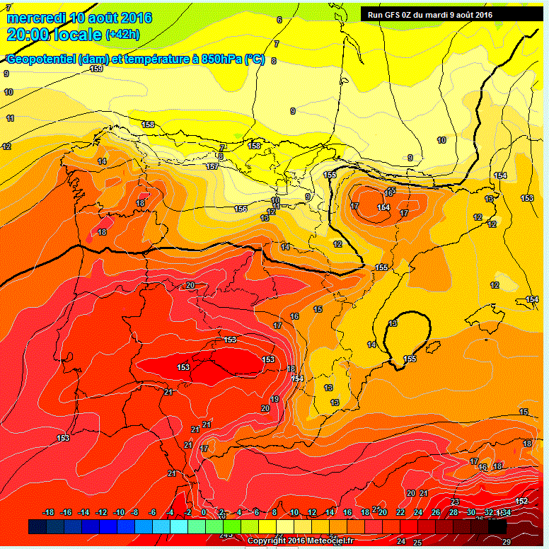 Os paso dos mapas previstos de temperatura a 850 hpa ( 1500 metros) previstos para mañana miércoles  y el jueves. Más bien parecen mapas de mediados del mes Septiembre.  Si se cumple estos mapas, las temperaturas máximas no creo que sobrepasen los 34 grados y las mínimas los 18 o 19. Fuente meteociel gfs.