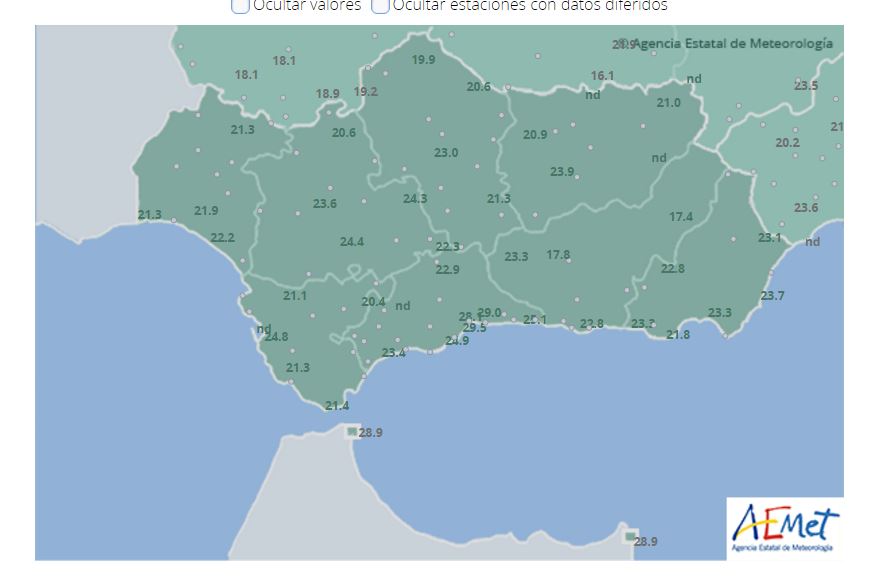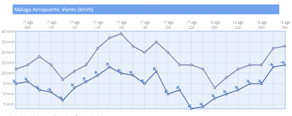 Os paso el gráfico de viento de la aemet del Aeropuerto. Y las temperaturas que teníamos a las cinco de la mañana en nuestra comunidad. Fijaros en las estaciones de Málaga. Casi 30 grados.