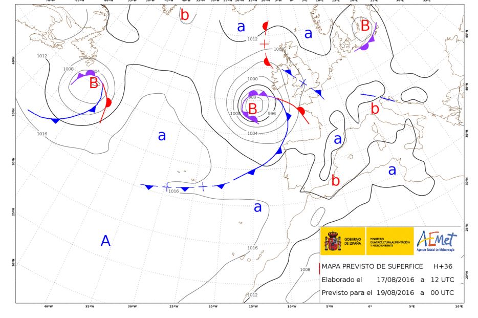 En este mapa de superficie elaborado por la aemet, se ve claramente el por qué de este cambio de viento que tendremos hasta el sabado. Borrasca al oeste de Galicia y bajada de latitud del anticiclón.