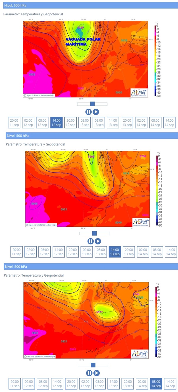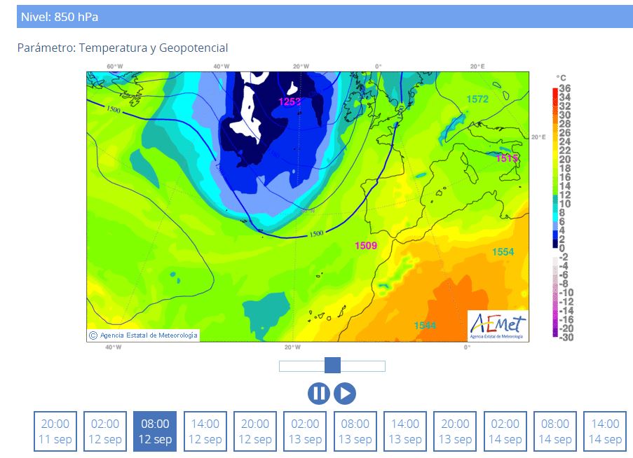 Esta vaguada al llegar a la península se estrangulara, y formara una dana ( depresión aislada en niveles altos) en el norte peninsular. De todas formas aún no esta muy claro si la dana se formara un poco mas arriba o más abajo, más a la izquierda o a la derecha. La pena es que definitivamente no se formara en el Cabo de San Vicente como apuntaban algunos modelos hace unos dias. Si hubiera sido así, las lluvias y las tormentas habrían sido protagonistas en nuestra comunidad. Os paso unos mapas a 500 hpa ( 5500 metros) donde podéis ver la formación y la posible ubicación de la dana. Fuente hirlam ,aemet.